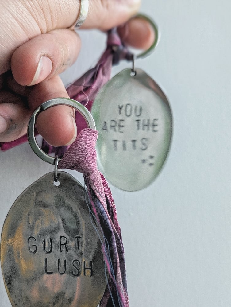 Recycled spoon and silk handmade keyrings, hand stamped with "you are the tits" or "gurt lush"